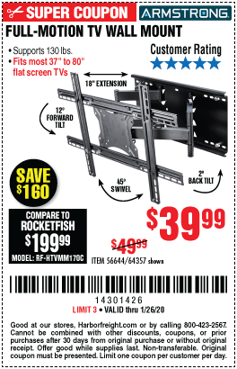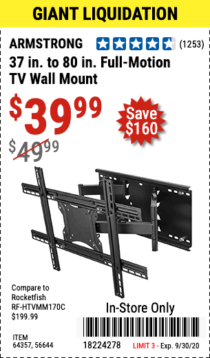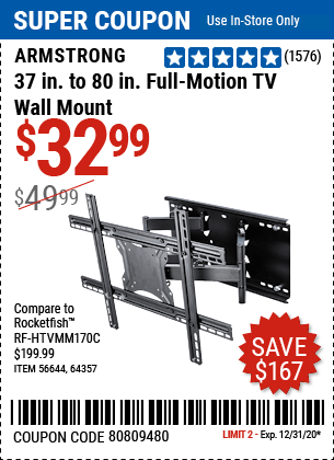 ARMSTRONG 37 IN. TO 80 IN. FULL-MOTION TV WALL MOUNT Lot No. 64357 Expired: 1/26/20 - $39.99 Coupon Code: '14301426'