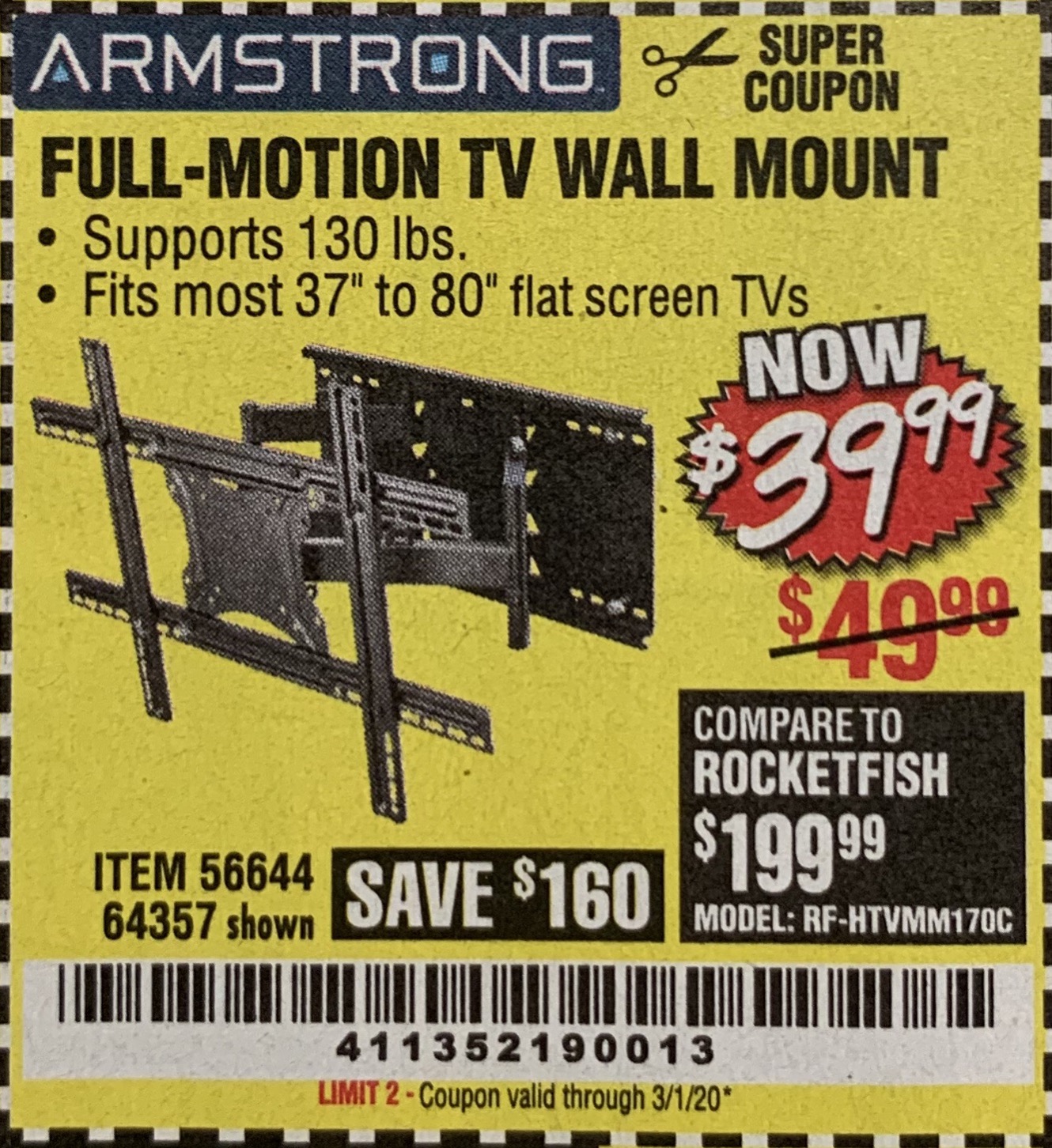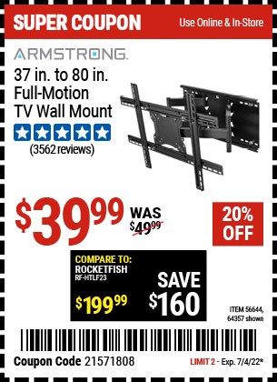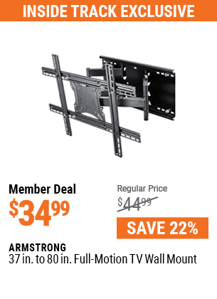 ARMSTRONG 37 IN. TO 80 IN. FULL-MOTION TV WALL MOUNT Lot No. 64357 Valid Thru: 4/9/26 - $34.99 Coupon Code: 'n/a' (current price - 20% = 0) add to list