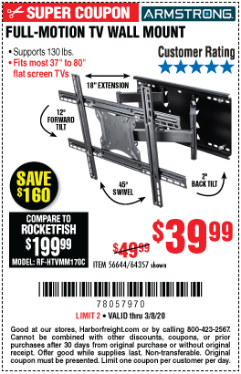 ARMSTRONG 37 IN. TO 80 IN. FULL-MOTION TV WALL MOUNT Lot No. 64357 Expired: 3/8/20 - $39.99 Coupon Code: '78057970'