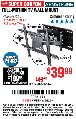 ARMSTRONG 37 IN. TO 80 IN. FULL-MOTION TV WALL MOUNT Lot No. 64357 Expired: 3/22/20 - $39.99 Coupon Code: '77491556'