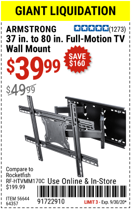 ARMSTRONG 37 IN. TO 80 IN. FULL-MOTION TV WALL MOUNT Lot No. 64357 Expired: 10/7/20 - $39.99 Coupon Code: '76437307'