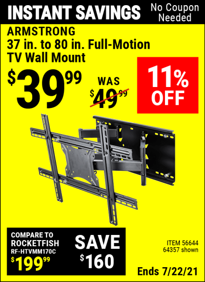 ARMSTRONG 37 IN. TO 80 IN. FULL-MOTION TV WALL MOUNT Lot No. 64357 Expired: 7/22/21 - $39.99 Coupon Code: 'n/a'