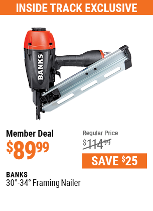 BANKS 30° TO 34° FRAMING NAILER Lot No. 64139 Expired: 6/30/20 - $79.99 Coupon Code: '69493734'