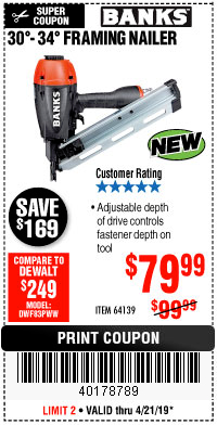 BANKS 30° TO 34° FRAMING NAILER Lot No. 64139 Expired: 4/21/19 - $79.99 Coupon Code: '40178789'