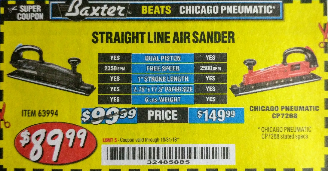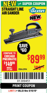 BAXTER PROFESSIONAL STRAIGHT LINE AIR SANDER Lot No. 63994 Expired: 8/31/18 - $89.99 Coupon Code: '45360992'