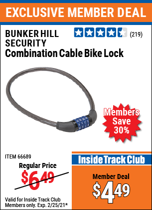BUNKER HILL SECURITY COMBINATION CABLE BIKE LOCK Lot No. 66689 Valid Thru: 4/9/26 - $3.99 Coupon Code: 'n/a' (current price - 20% = 0) add to list