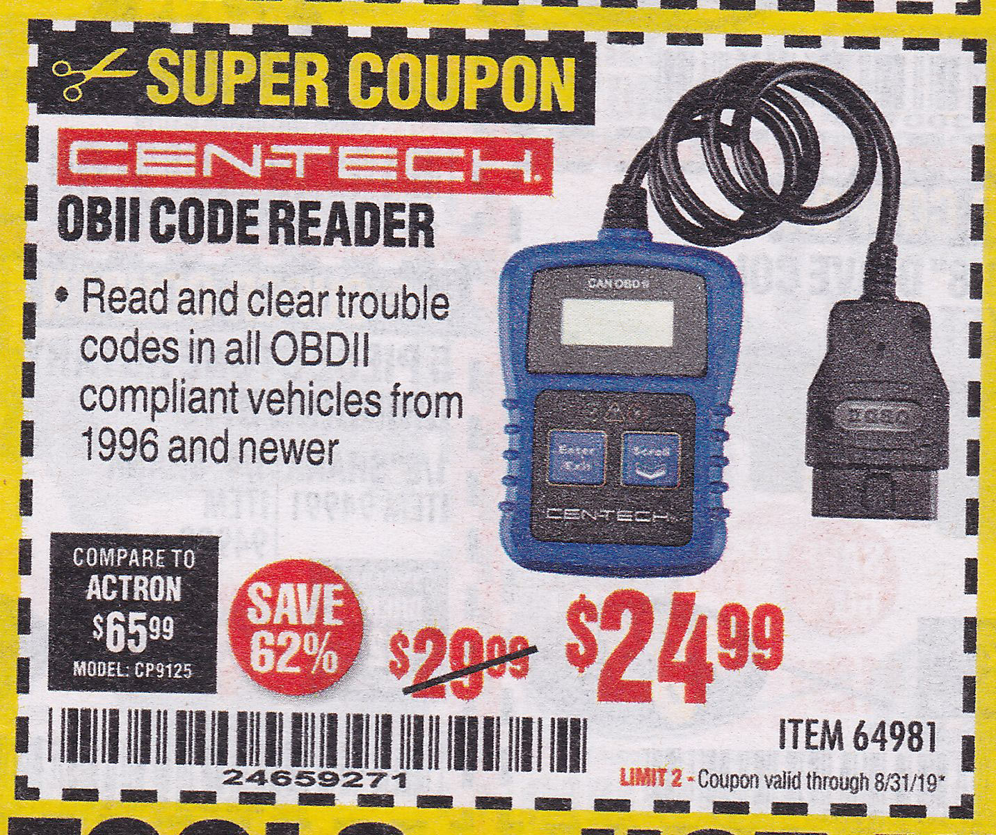 CEN-TECH OBDII CODE READER Lot No. 64981 Expired: 7/21/19 - $24.99 Coupon Code: '39479033'
