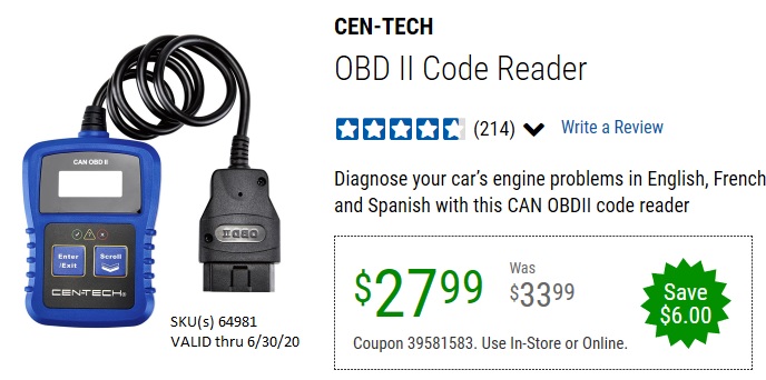 CEN-TECH OBDII CODE READER Lot No. 64981 Expired: 6/30/20 - $27.99 Coupon Code: '39581583'