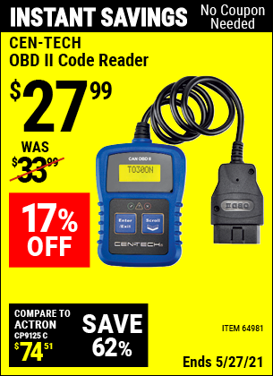 CEN-TECH OBDII CODE READER Lot No. 64981 Expired: 4/29/21 - $27.99 Coupon Code: 'n/a'