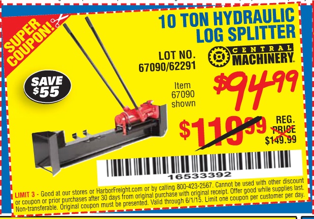 CENTRAL MACHINERY 10 TON HYDRAULIC LOG SPLITTER Lot No. 67090/62291 Expired: 6/1/15 - $94.99 Coupon Code: '16533392'
