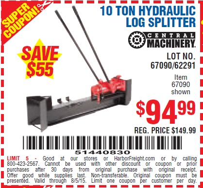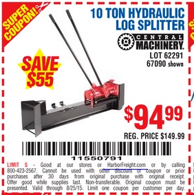 CENTRAL MACHINERY 10 TON HYDRAULIC LOG SPLITTER Lot No. 67090/62291 Expired: 8/25/15 - $94.99 Coupon Code: '11550791'