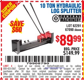 CENTRAL MACHINERY 10 TON HYDRAULIC LOG SPLITTER Lot No. 67090/62291 Expired: 10/18/15 - $89.99 Coupon Code: '80943656'