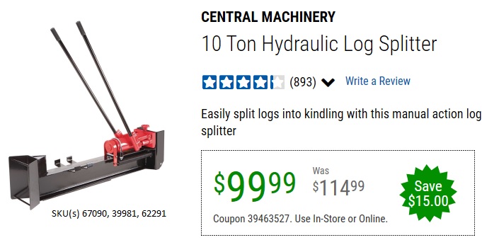 ITC CENTRAL MACHINERY 10 TON HYDRAULIC LOG SPLITTER Lot No. 67090/62291 Valid Thru: 1/29/26 - $129.99 Coupon Code: 'n/a' (current price No % off) add to list