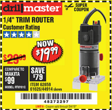 DRILL MASTER 2.4 AMP TRIM ROUTER Lot No. 62659/44914/61626/64314 Expired: 5/4/19 - $19.99 Coupon Code: '48272297'
