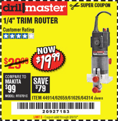 DRILL MASTER 2.4 AMP TRIM ROUTER Lot No. 62659/44914/61626/64314 Expired: 8/9/19 - $19.99 Coupon Code: '20927183'