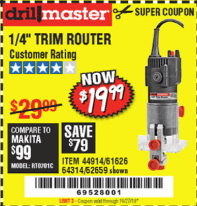 DRILL MASTER 2.4 AMP TRIM ROUTER Lot No. 62659/44914/61626/64314 Expired: 10/27/19 - $19.99 Coupon Code: '69528001'