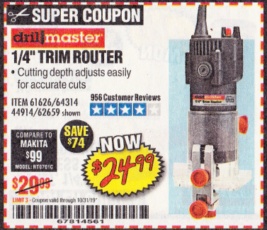 DRILL MASTER 2.4 AMP TRIM ROUTER Lot No. 62659/44914/61626/64314 Expired: 10/31/19 - $24.99 Coupon Code: '67814561'