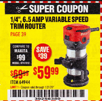 DRILL MASTER 2.4 AMP TRIM ROUTER Lot No. 62659/44914/61626/64314 Expired: 1/31/20 - $59.99 Coupon Code: '39256380'