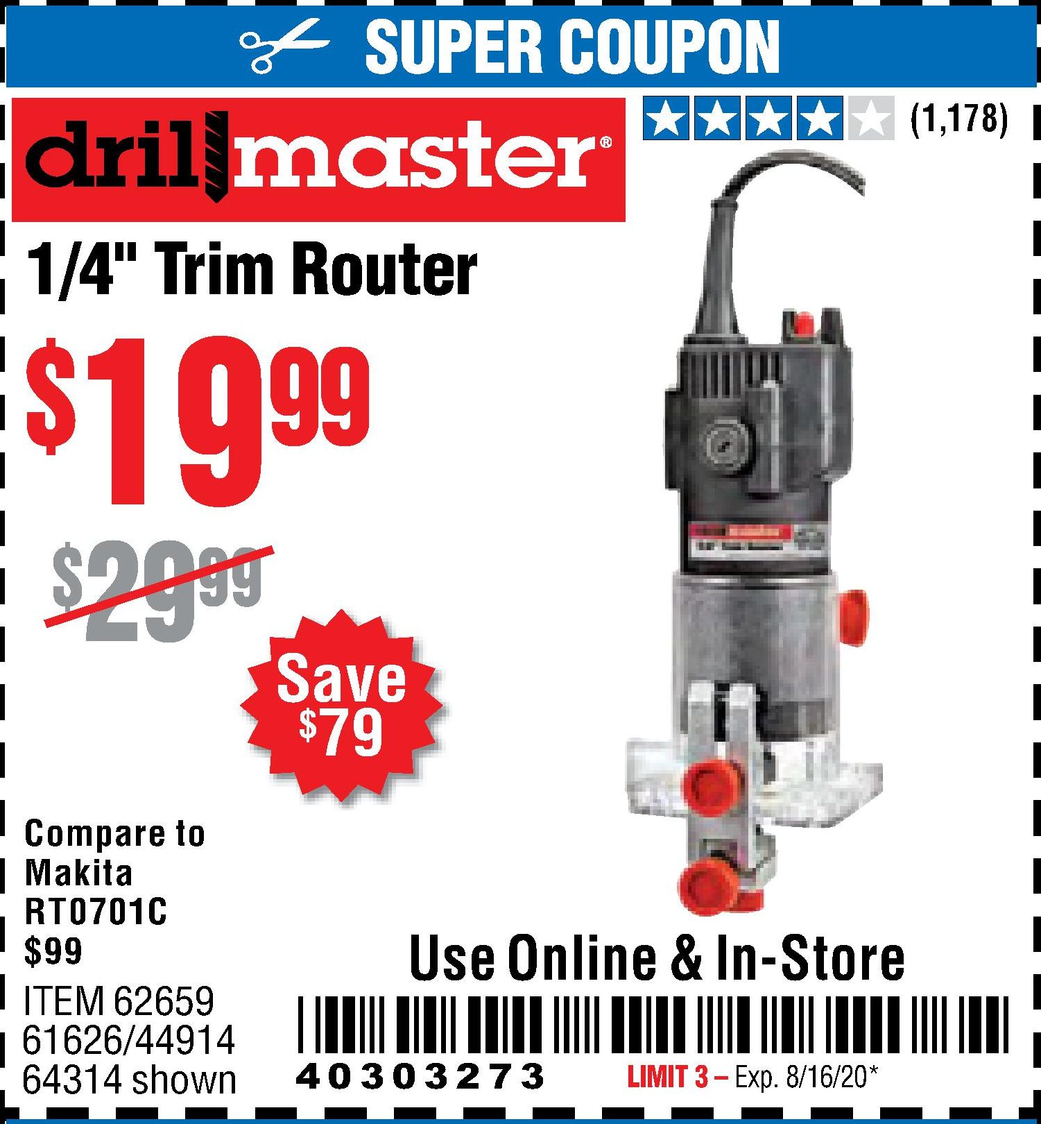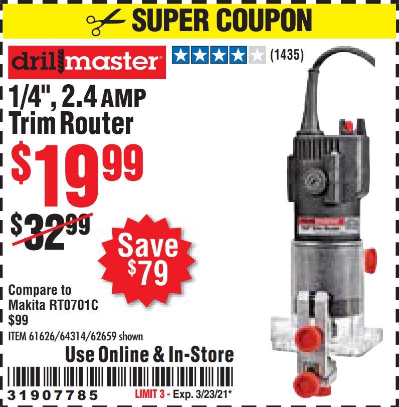 DRILL MASTER 2.4 AMP TRIM ROUTER Lot No. 62659/44914/61626/64314 Expired: 3/31/20 - $24.99 Coupon Code: '58911791'