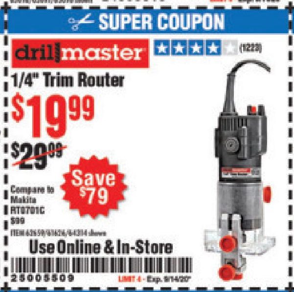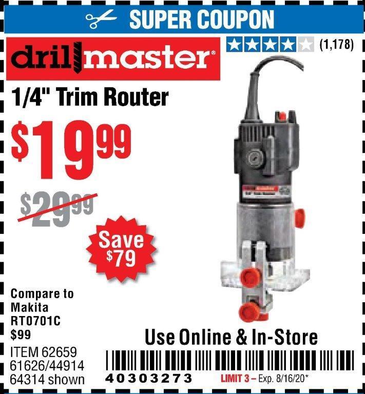 DRILL MASTER 2.4 AMP TRIM ROUTER Lot No. 62659/44914/61626/64314 Expired: 9/14/20 - $19.99 Coupon Code: '25005509'