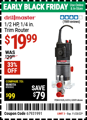 DRILL MASTER 2.4 AMP TRIM ROUTER Lot No. 62659/44914/61626/64314 Expired: 1/23/22 - $19.99 Coupon Code: '67931991'