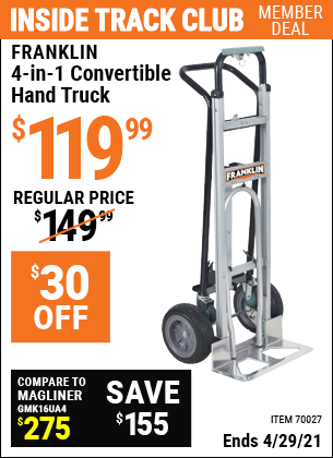 FRANKLIN 4-IN-1 CONVERTIBLE HAND TRUCK, 500 LB./800 LB./1000 LB. CAPACITY Lot No. 70027 Expired: 6/30/20 - $119.99 Coupon Code: '37208020'