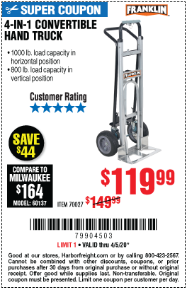 FRANKLIN 4-IN-1 CONVERTIBLE HAND TRUCK, 500 LB./800 LB./1000 LB. CAPACITY Lot No. 70027 Expired: 6/30/20 - $119.99 Coupon Code: '79904503'