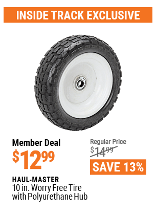 HAUL-MASTER 10 IN. WORRY-FREE TIRE WITH POLYURETHANE HUB Lot No. 96691 Expired: 10/10/24 - $12.99 Coupon Code: 'n/a'