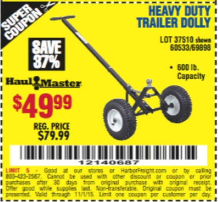 HAUL-MASTER 600 LB. TRAILER DOLLY Lot No. 60533/69898 Expired: 10/30/15 - $49.99 Coupon Code: '10555788'