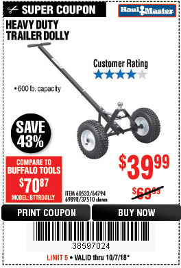 HAUL-MASTER 600 LB. TRAILER DOLLY Lot No. 60533/69898 Expired: 10/7/18 - $39.99 Coupon Code: '38597024'