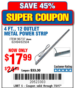 HFT 12-OUTLET, 4 FT. METAL POWER STRIP Lot No. 96737 Expired: 7/3/17 - $17.99 Coupon Code: '20523303'