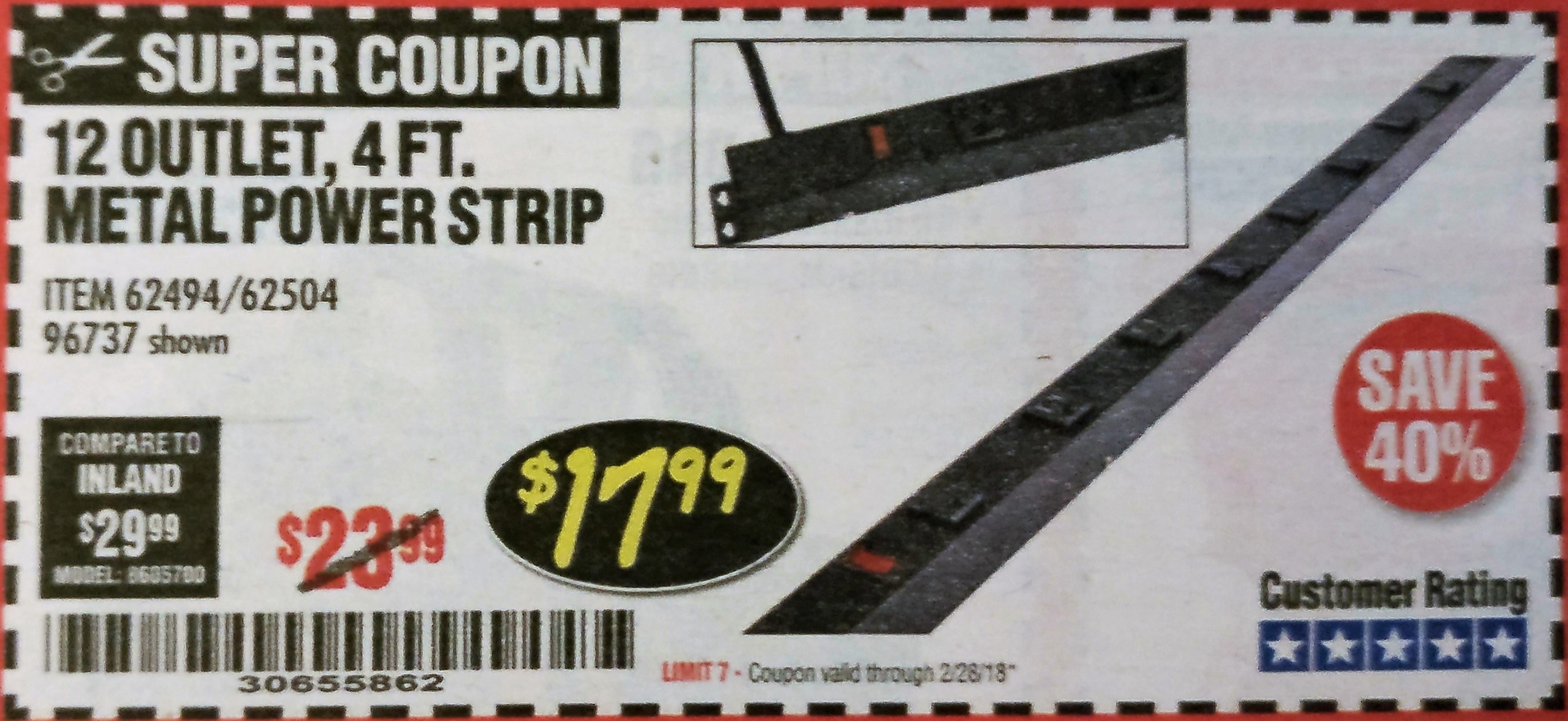HFT 12-OUTLET, 4 FT. METAL POWER STRIP Lot No. 96737 Expired: 2/28/18 - $17.99 Coupon Code: '30655862'
