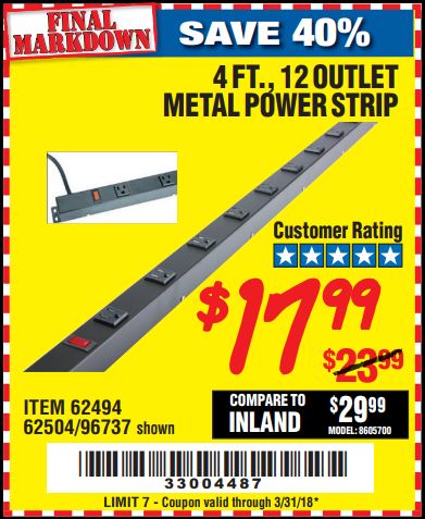 HFT 12-OUTLET, 4 FT. METAL POWER STRIP Lot No. 96737 Expired: 3/31/18 - $17.99 Coupon Code: '33004487'