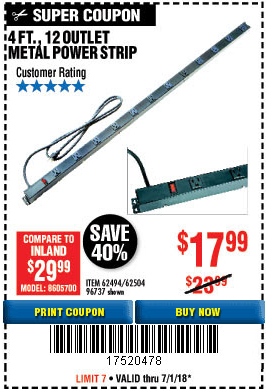 HFT 12-OUTLET, 4 FT. METAL POWER STRIP Lot No. 96737 Expired: 7/2/18 - $17.99 Coupon Code: '17520478'