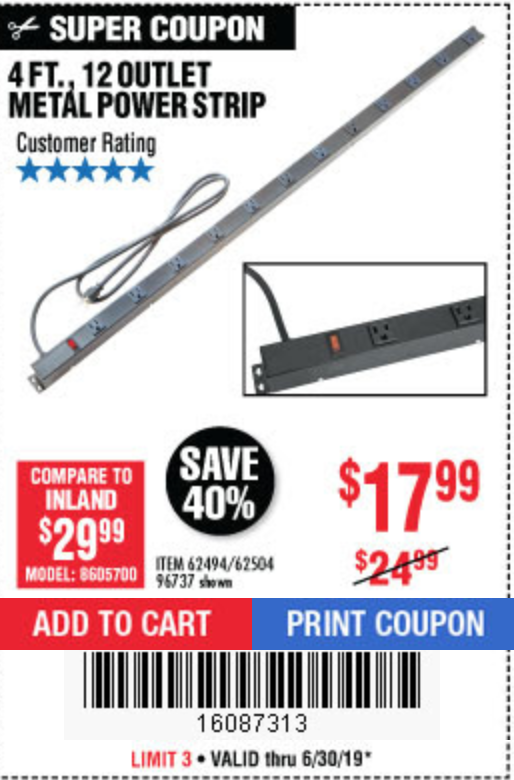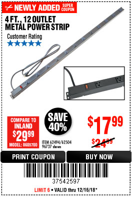 HFT 12-OUTLET, 4 FT. METAL POWER STRIP Lot No. 96737 Expired: 6/30/19 - $17.99 Coupon Code: '16087313'