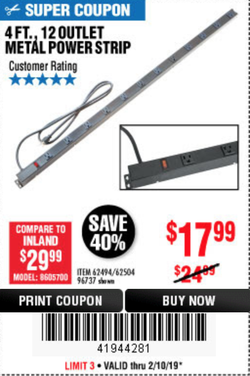 HFT 12-OUTLET, 4 FT. METAL POWER STRIP Lot No. 96737 Expired: 2/10/19 - $17.99 Coupon Code: '41944281'