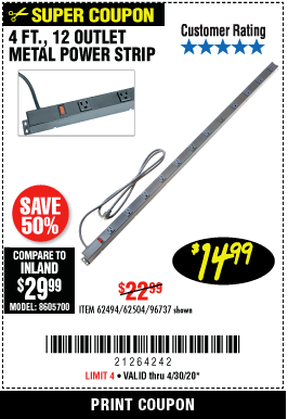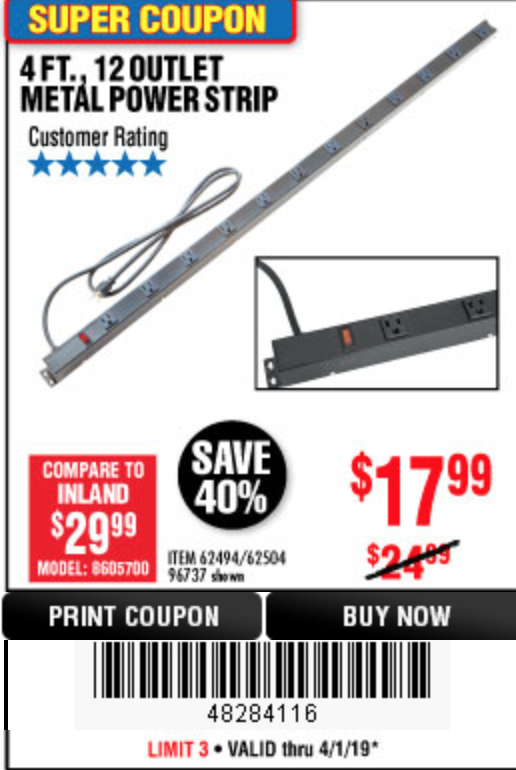 HFT 12-OUTLET, 4 FT. METAL POWER STRIP Lot No. 96737 Expired: 4/1/19 - $17.99 Coupon Code: '48284116'