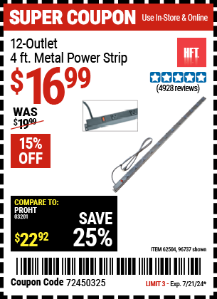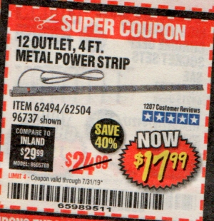 HFT 12-OUTLET, 4 FT. METAL POWER STRIP Lot No. 96737 Expired: 7/31/19 - $17.99 Coupon Code: '65989511'