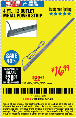 HFT 12-OUTLET, 4 FT. METAL POWER STRIP Lot No. 96737 Expired: 1/31/20 - $16.99 Coupon Code: '77404739'