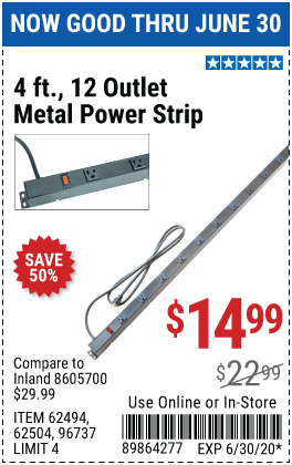 HFT 12-OUTLET, 4 FT. METAL POWER STRIP Lot No. 96737 Expired: 6/30/20 - $14.99 Coupon Code: '89864277'