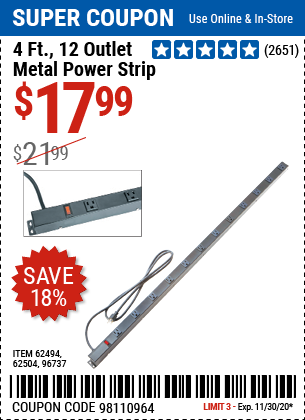 HFT 12-OUTLET, 4 FT. METAL POWER STRIP Lot No. 96737 Expired: 11/30/20 - $17.99 Coupon Code: '98110964'