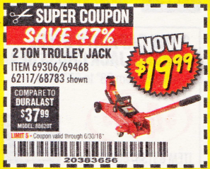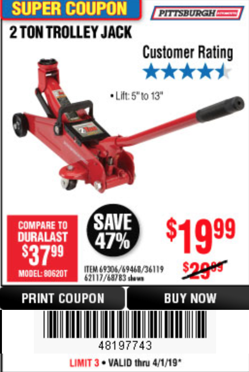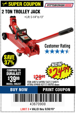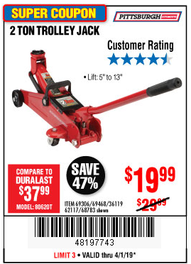 PITTSBURGH 2 TON COMPACT TROLLEY JACK Lot No. 64874 Expired: 6/30/19 - $19.99 Coupon Code: '89969313'
