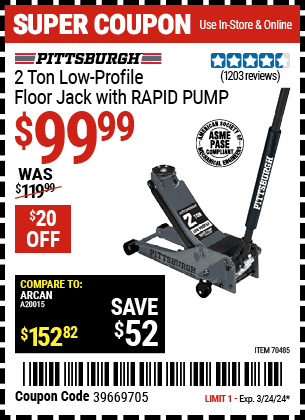 PITTSBURGH 2 TON LOW-PROFILE FLOOR JACK WITH RAPID PUMP, SLATE GRAY Lot No. 70485 Valid Thru: 3/22/26 - $109.99 Coupon Code: '19992006' (current price - 20% = 0) add to list