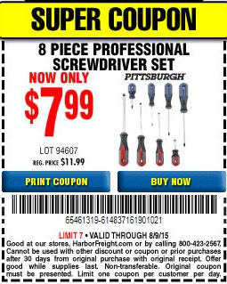 PITTSBURGH SCREWDRIVER SET, 8-PIECE Lot No. 94607 Expired: 6/7/15 - $7.99 Coupon Code: '84714810'