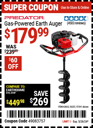PREDATOR GAS-POWERED EARTH AUGER Lot No. 63022/56257/57341 Expired: 5/26/24 - $179.99 Coupon Code: '49083757'