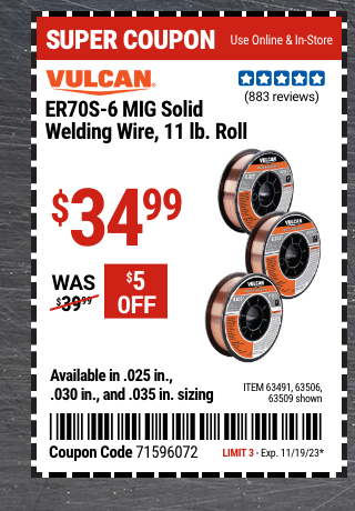 VULCAN 0.025 IN. ER70S-6 MIG SOLID WELDING WIRE, 11 LB. ROLL Lot No. 63491 Expired: 11/19/23 - $34.99 Coupon Code: '71596072'