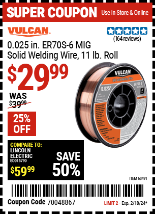 VULCAN 0.025 IN. ER70S-6 MIG SOLID WELDING WIRE, 11 LB. ROLL Lot No. 63491 Expired: 2/18/24 - $29.99 Coupon Code: '70048867'