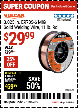 VULCAN 0.025 IN. ER70S-6 MIG SOLID WELDING WIRE, 11 LB. ROLL Lot No. 63491 Expired: 4/28/24 - $29.99 Coupon Code: '25196985'