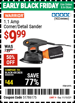 WARRIOR 1.1 AMP CORNER/DETAIL SANDER Lot No. 63976 Expired: 11/13/22 - $9.99 Coupon Code: '51786175'
