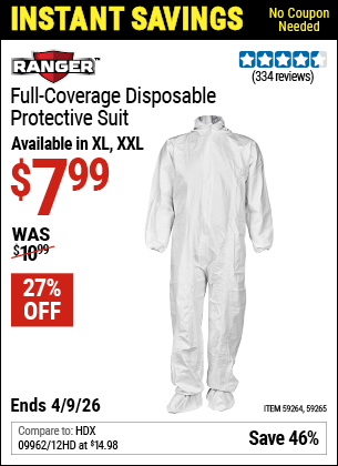 RANGER FULL-COVERAGE DISPOSABLE PROTECTIVE SUIT Lot No. 59264/59265 EXPIRES: 4/9/26 - $7.99 Coupon Code: 'n/a' view all (1) (current price - 20% = 0) | search the web
